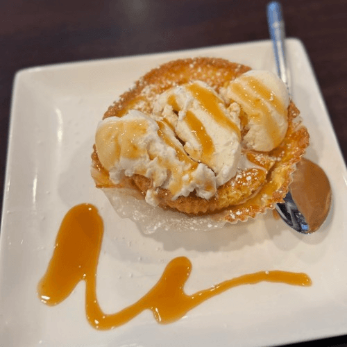 Rich brown butter cake topped with caramel swirl and vanilla bean ice cream